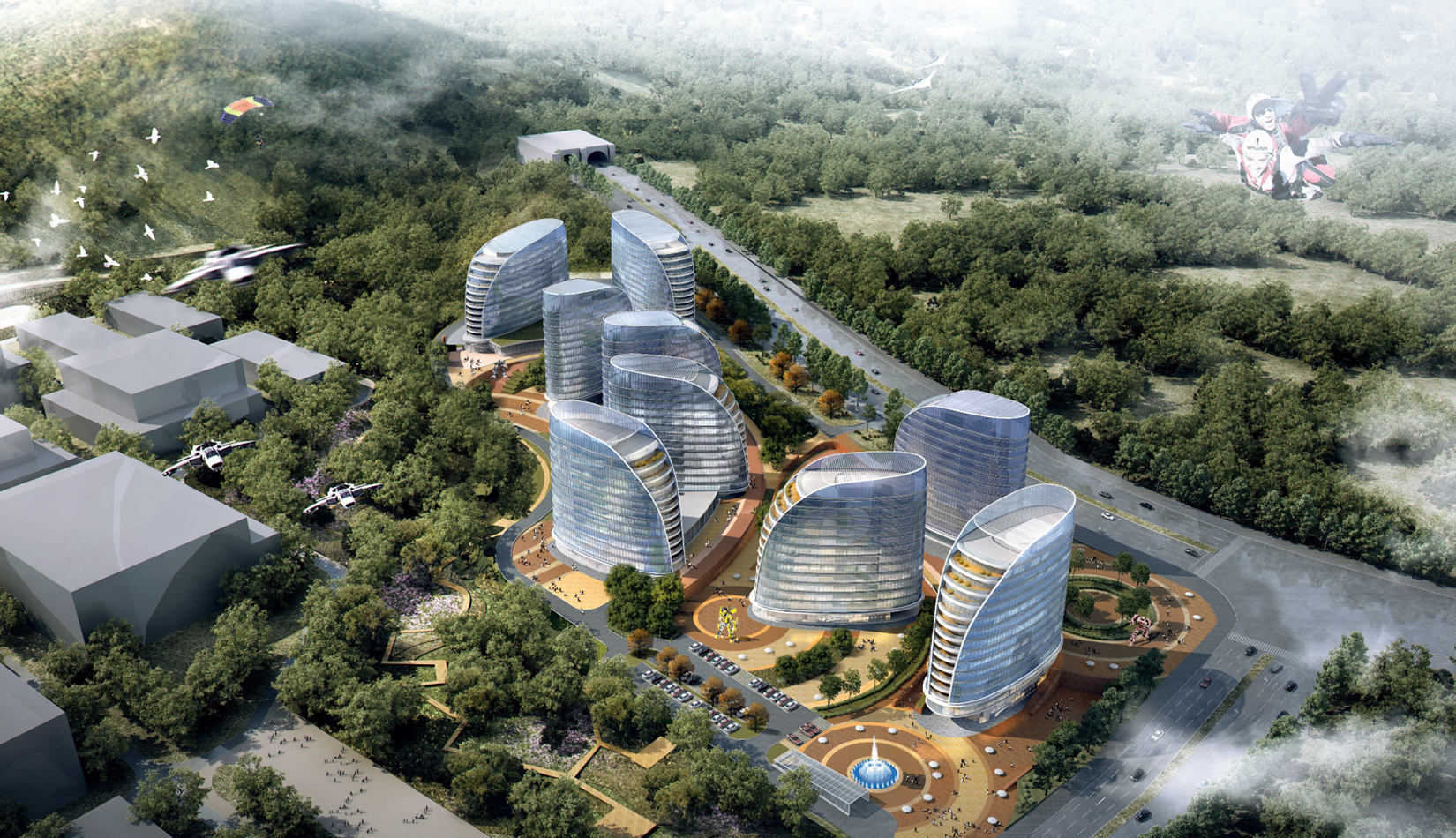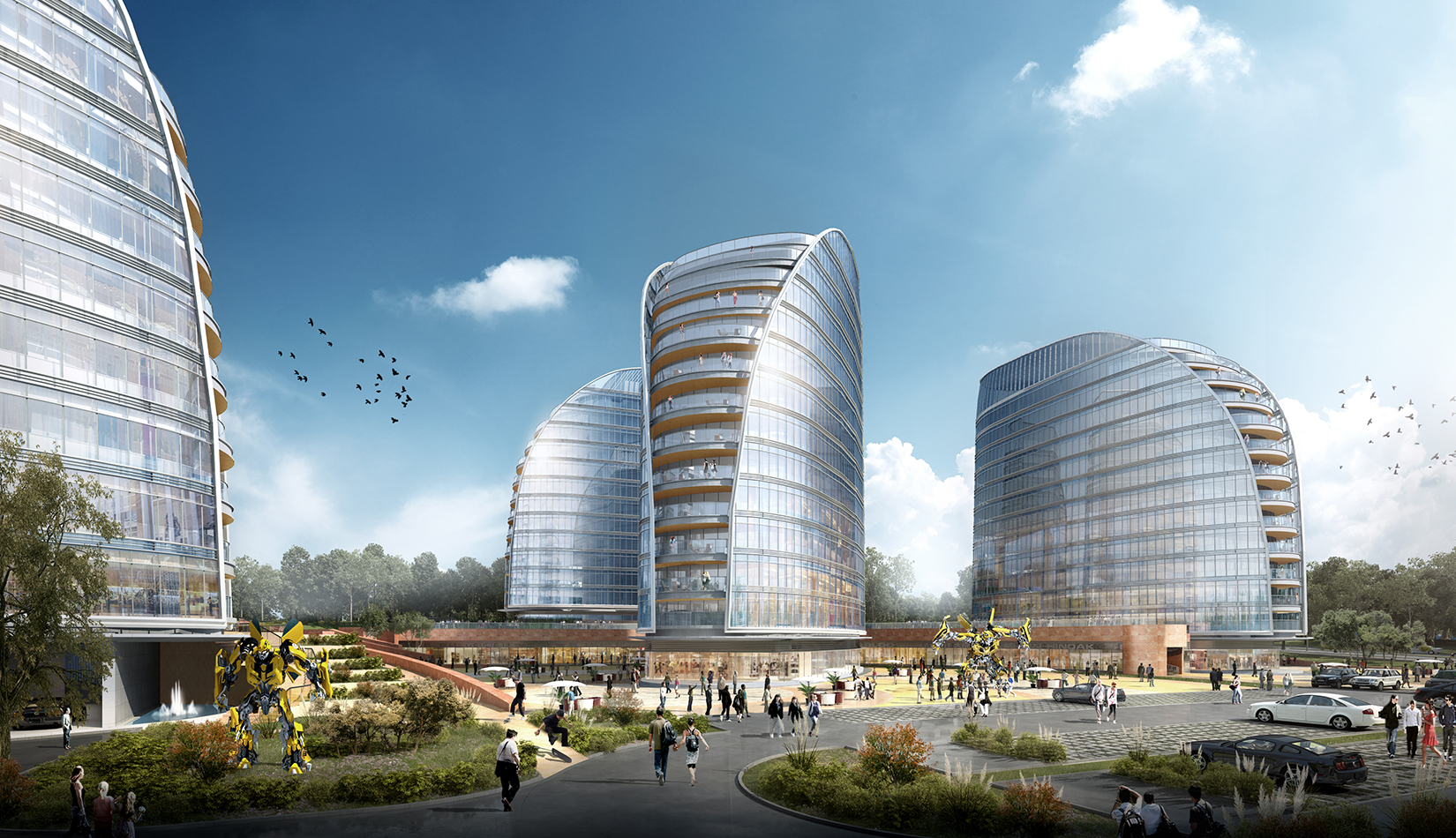 注重地塊內(nèi)空間環(huán)境的滲透和景觀視線效果,保持地塊環(huán)境與城市環(huán)境的共融性,提升城市空間價(jià)值。建筑外觀采用簡(jiǎn)潔、現(xiàn)代的風(fēng)格,立面形象富有視覺沖擊力,樹立企業(yè)品牌與形象。高層建筑層層平臺(tái)向景觀蔓延,為人們提供豐富多變的生活工作空間。底層平臺(tái)上的文化內(nèi)街,結(jié)合影視特色主題,聚集人氣,串聯(lián)互動(dòng)。曲線連廊內(nèi)部空間流動(dòng),成為具有活力的公共交往場(chǎng)所。