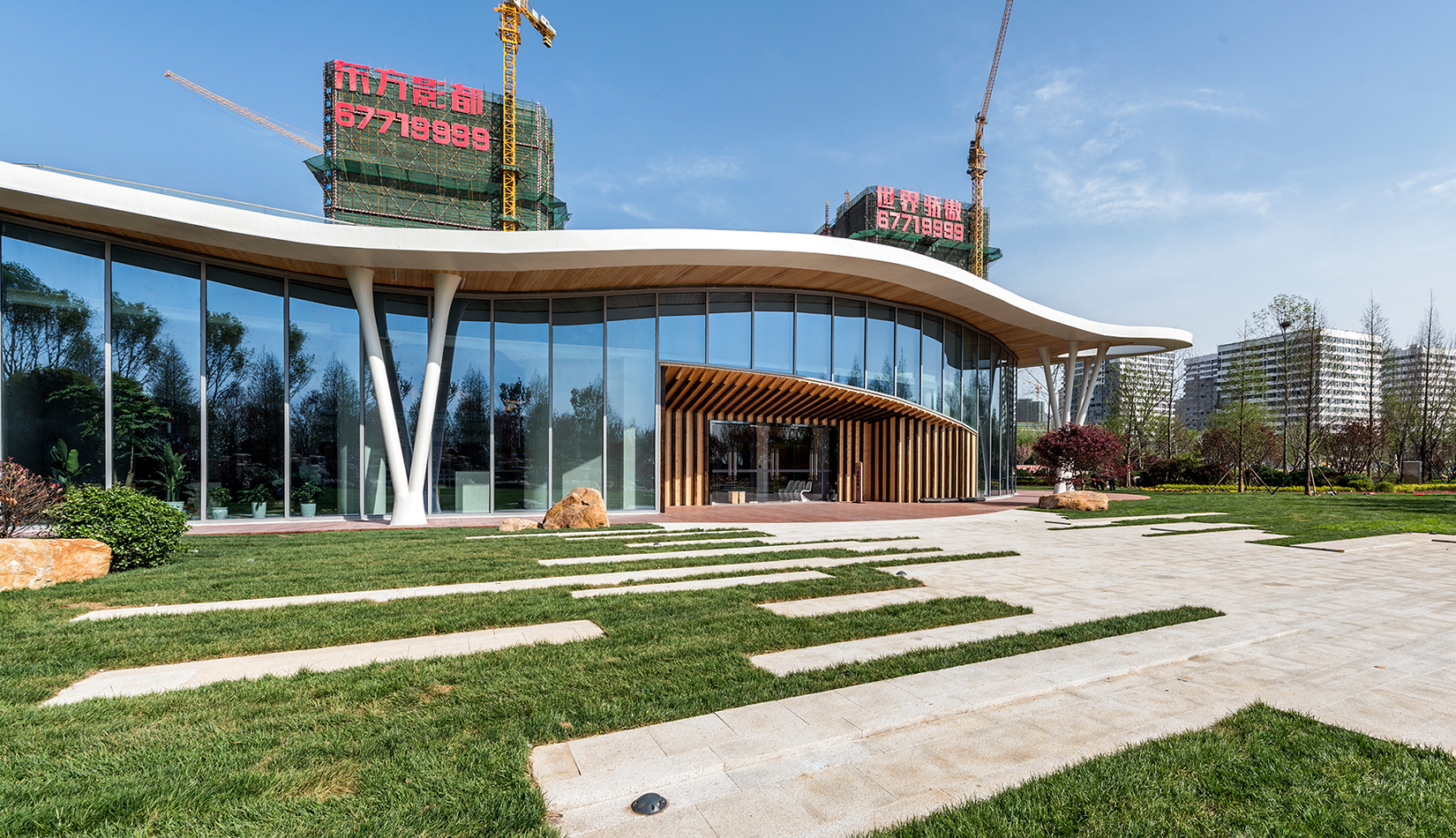 該項目以“森林中的小屋”為理念,通過“自由流水形態(tài)的木質(zhì)屋頂加純凈的玻璃幕墻”的組合,從而達到建筑與自然的共生,使得建筑真正的融合于自然風(fēng)景之中。設(shè)計師將節(jié)能、