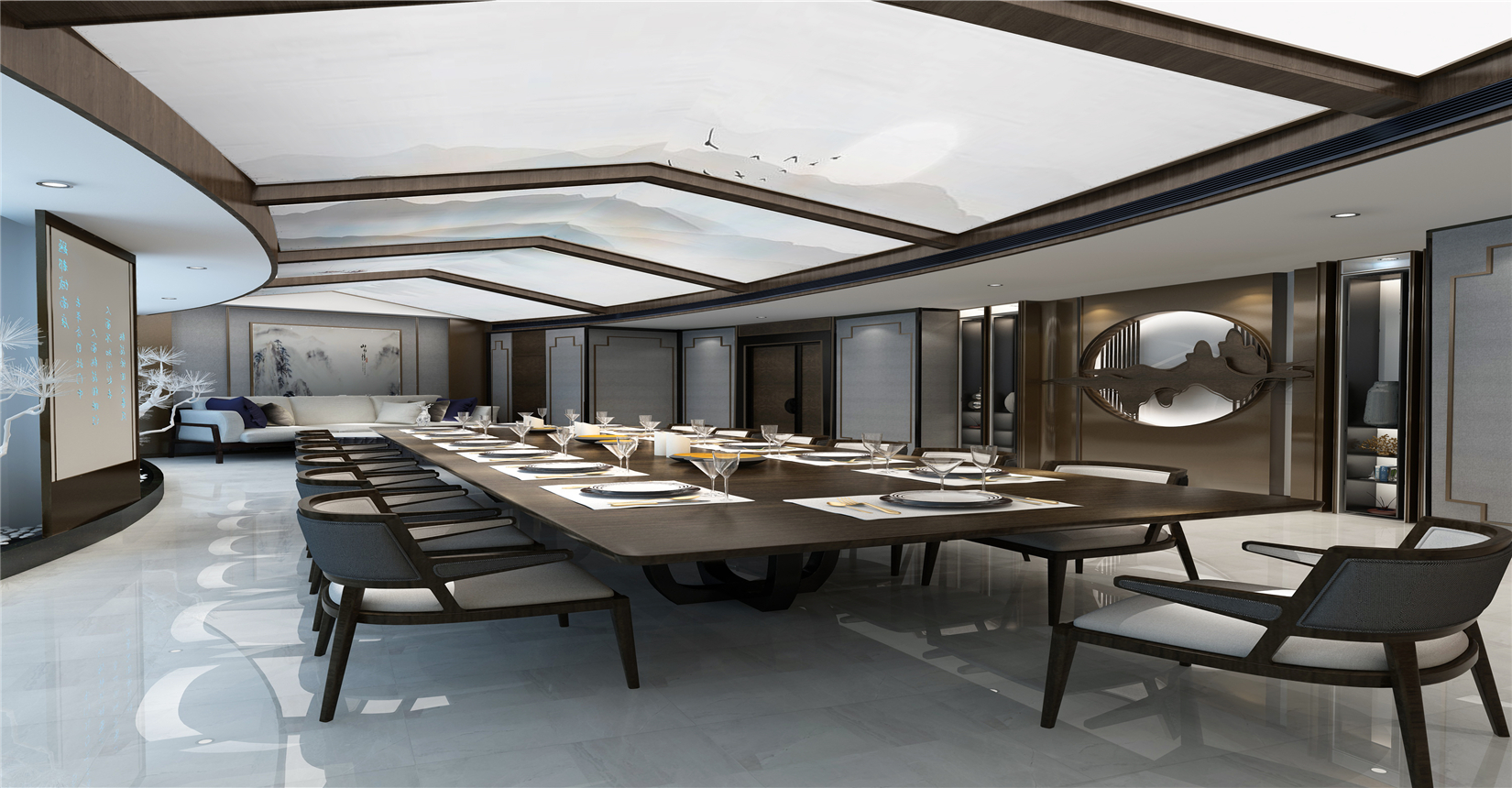 餐廳定位區(qū)別于傳統(tǒng)私人生態(tài)農(nóng)莊、農(nóng)家樂,需要更多結(jié)合智慧、科技、現(xiàn)代元素打造生態(tài)內(nèi)核,因此創(chuàng)新性地使用新東方主義設(shè)計風(fēng)格,將東方地域特色的典雅韻味植入于餐廳環(huán)境。在材料的使用上,多使用如花崗玉、裝飾纖維水泥板、仿古磚、防腐木地板等自然材料,突出餐廳的整體生態(tài)氛圍。