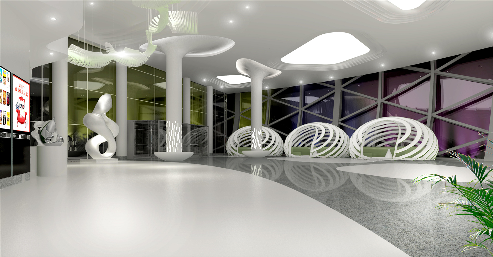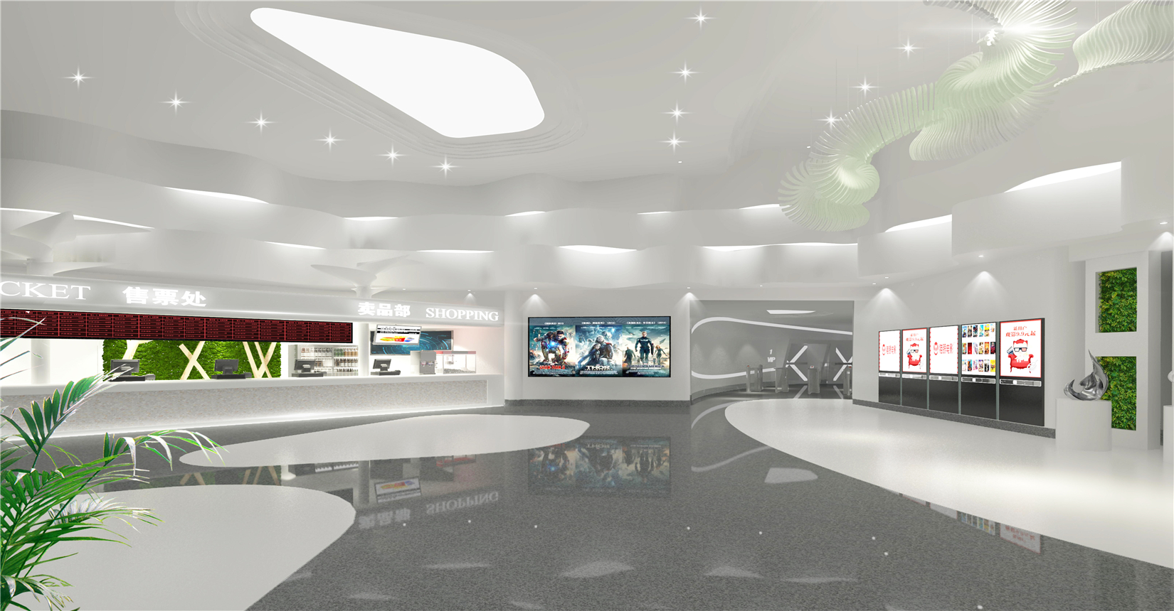 電影院在內(nèi)部空間造型設(shè)計上延續(xù)建筑外立面海螺鋼結(jié)構(gòu)美感,以連貫性曲線為特征,做到內(nèi)外形式美感相呼應(yīng)。以白色金屬板材、白色系魔石地坪及綠色植物垂直造景墻面為主材,全方面打造契合濕地文化主題的生態(tài)景觀體系影城。